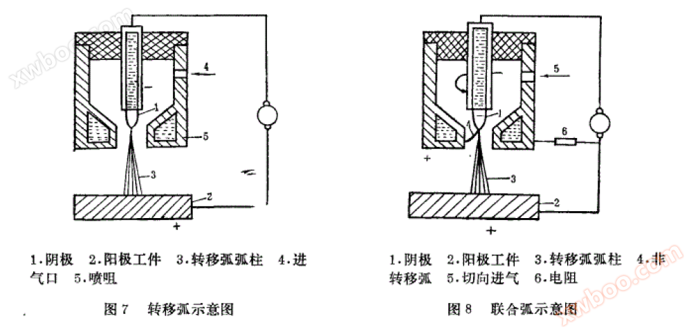 工作气由进气道4进入枪体内腔,然后由喷咀5喷出,使转移弧弧柱存在于工作气的气氛中。由于转移弧直接打在被加工的阳极工件上,所以对于工件的加热要比非转移弧的等离子焰对工件的加热要有效得多,所以一般金属切割、焊接、熔炼等工艺多采用转移弧的形式。